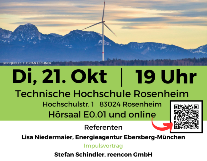 Rosenheim, 21.10.2025: Gut anderthalb Jahre nach dem letzten Vortragsabend zur Windenergie hat die Initiative „Rosenheimer Energiedialoge” erneut zu einer Veranstaltung zu diesem zentralen Baustein der Energiewende eingeladen. Ob vor Ort an der Technischen Hochschule Rosenheim oder im Livestream: Die vier Fachvorträge machten deutlich, dass sich in diesem Themenfeld und in der Region spürbar etwas bewegt.